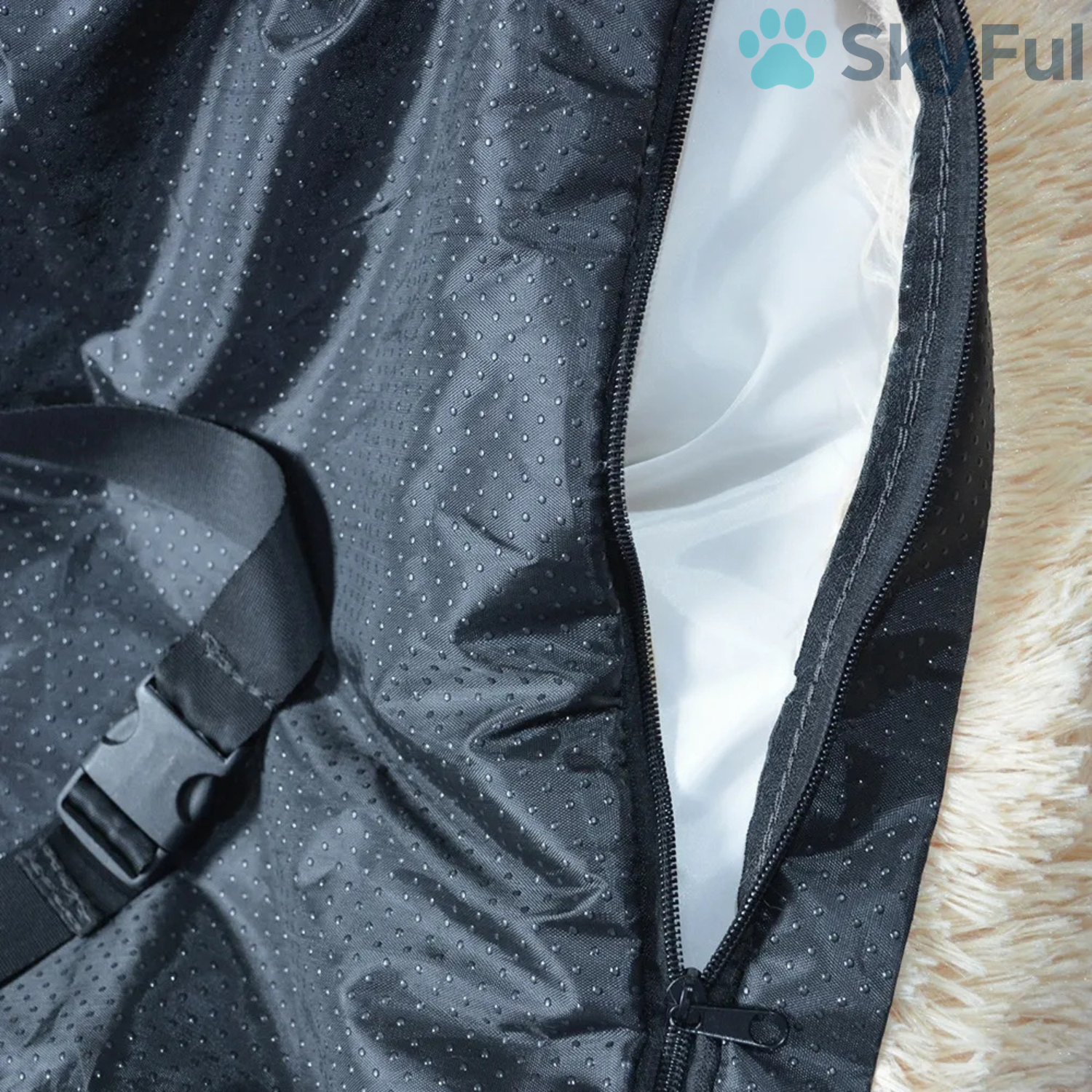 De SkyFul autostoel is gemaakt van hoogwaardig pluche en ademende stof, waardoor je huisdier het altijd comfortabel heeft — warm in de winter, koel in de zomer. De dikke, gewatteerde binnenkant zorgt voor een knus gevoel, terwijl de antislipbodem en stevige randen ervoor zorgen dat het kussen stabiel blijft, zelfs tijdens bochten of rembewegingen.